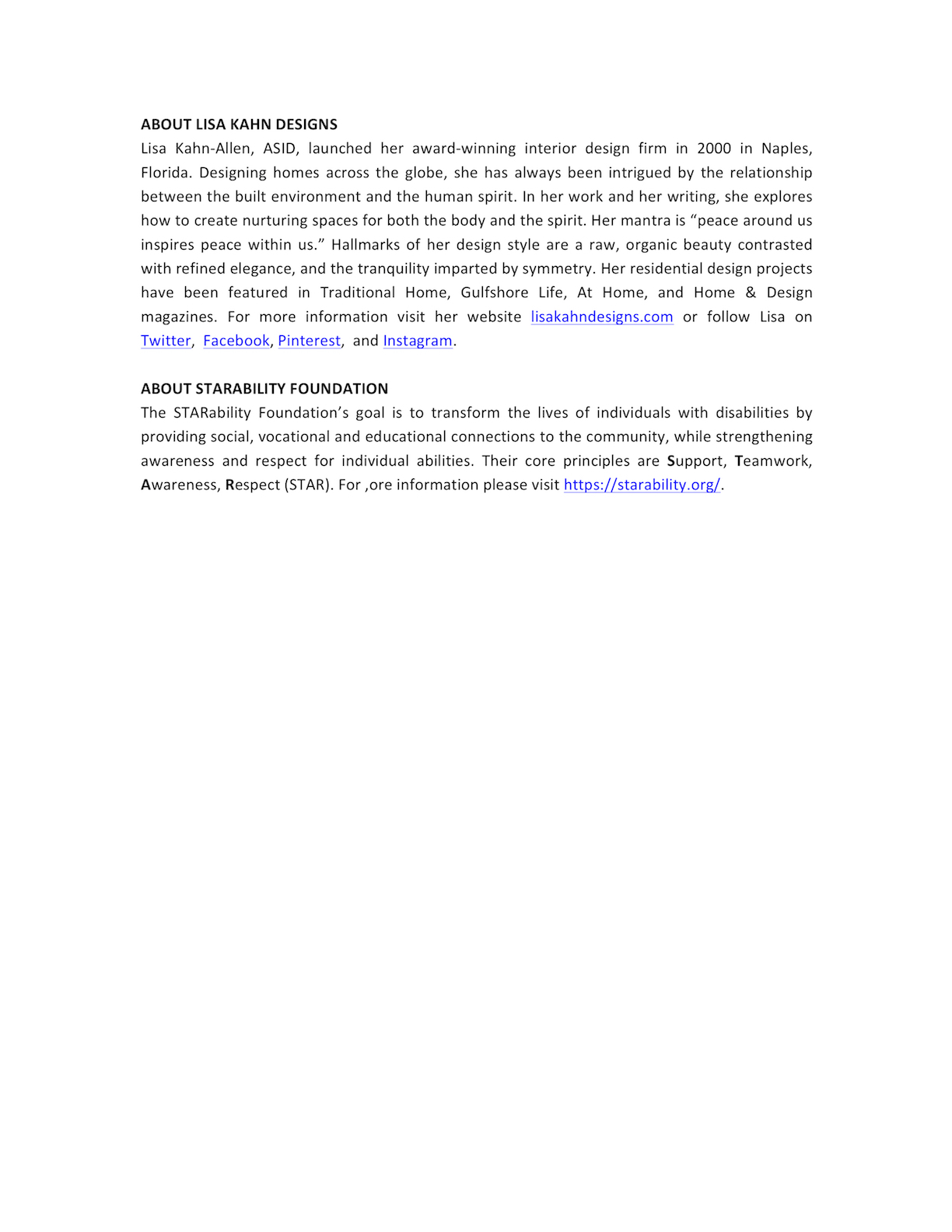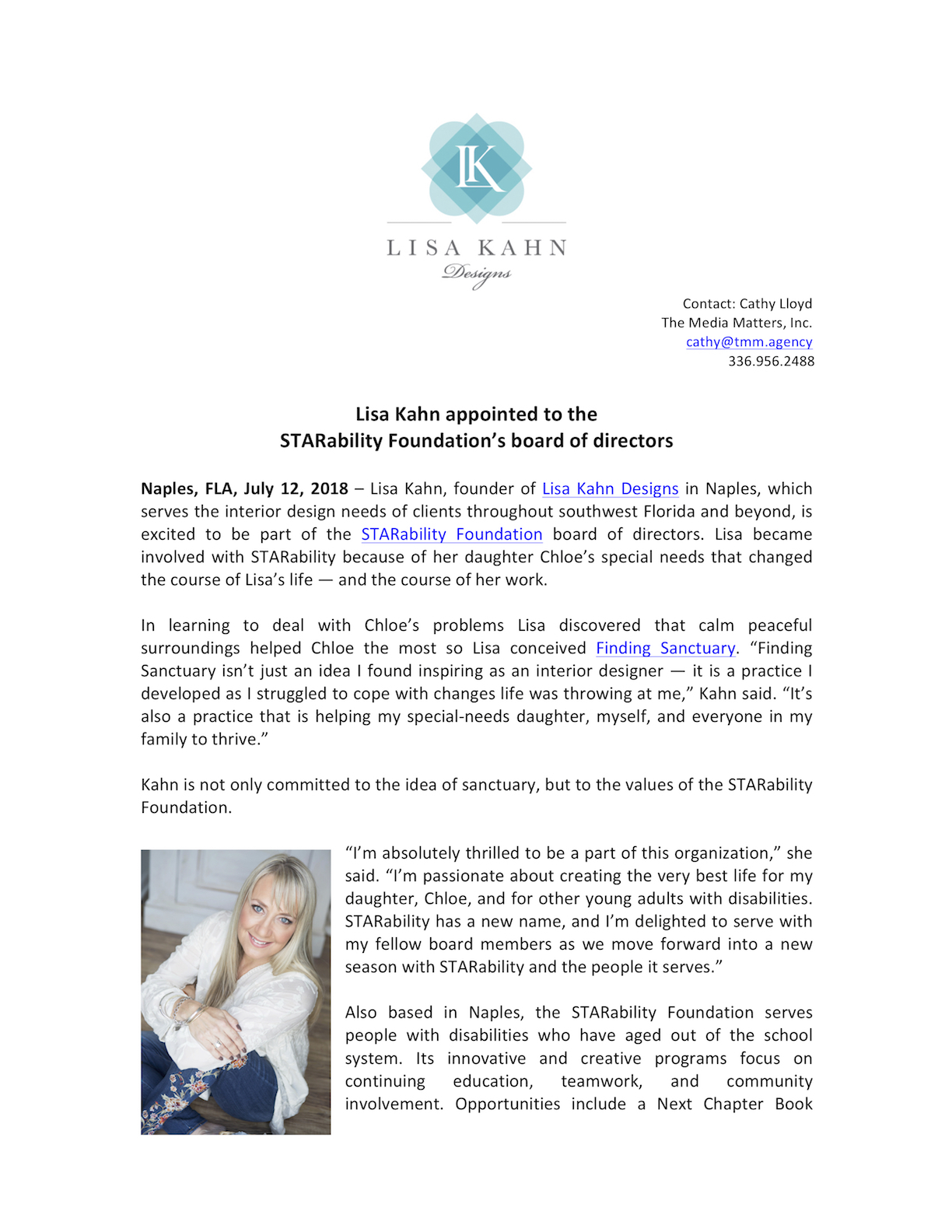 Lisa Kahn appointed to the STARability Foundation's board of directors, July 2018