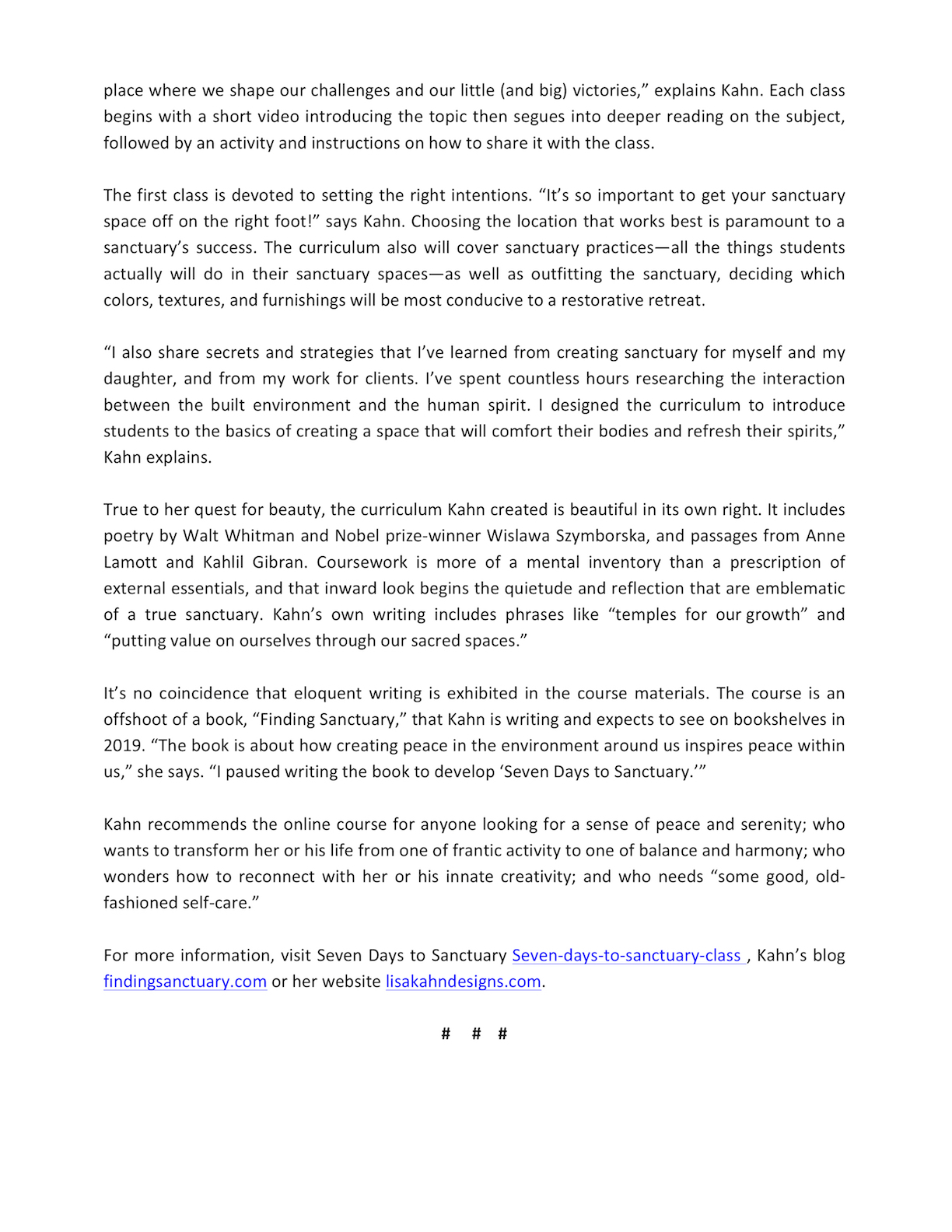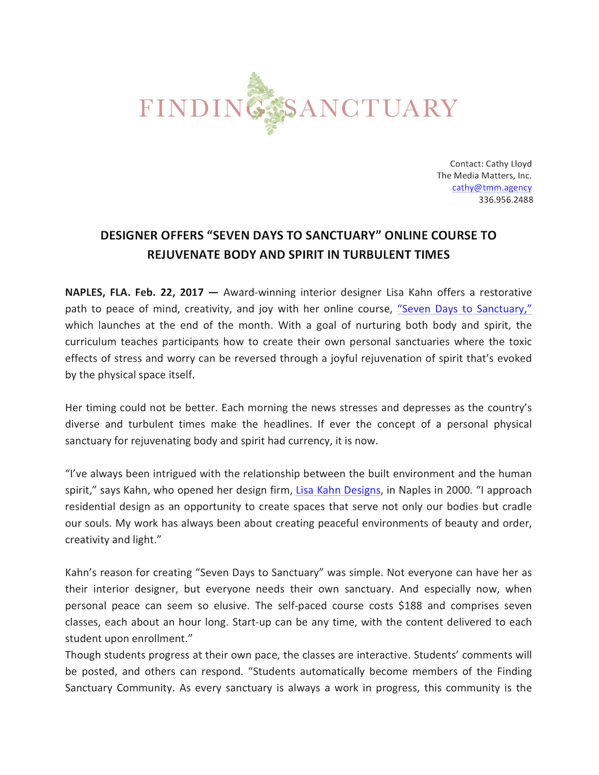 DESIGNER OFFERS “SEVEN DAYS TO SANCTUARY” ONLINE COURSE TO REJUVENATE BODY AND SPIRIT IN TURBULENT TIMES