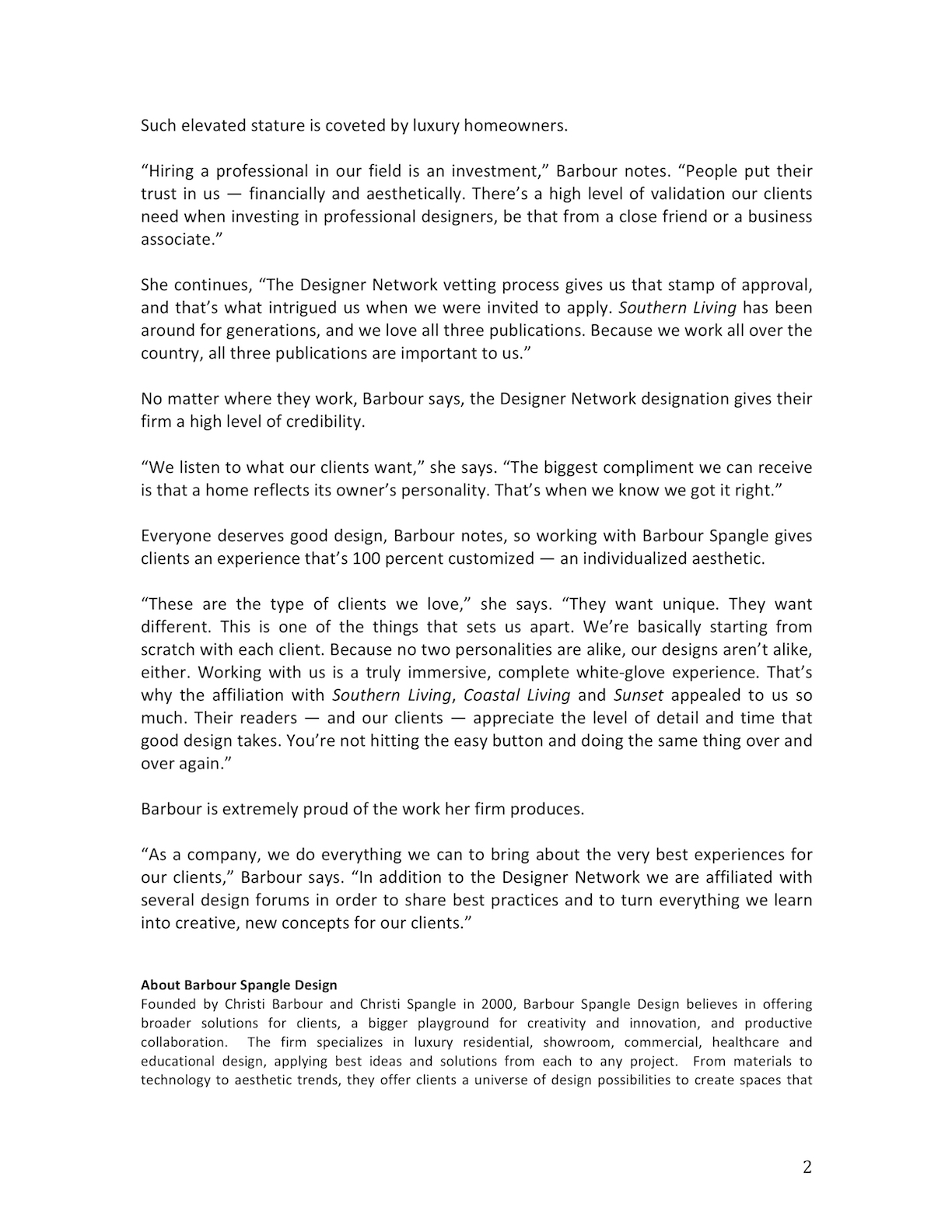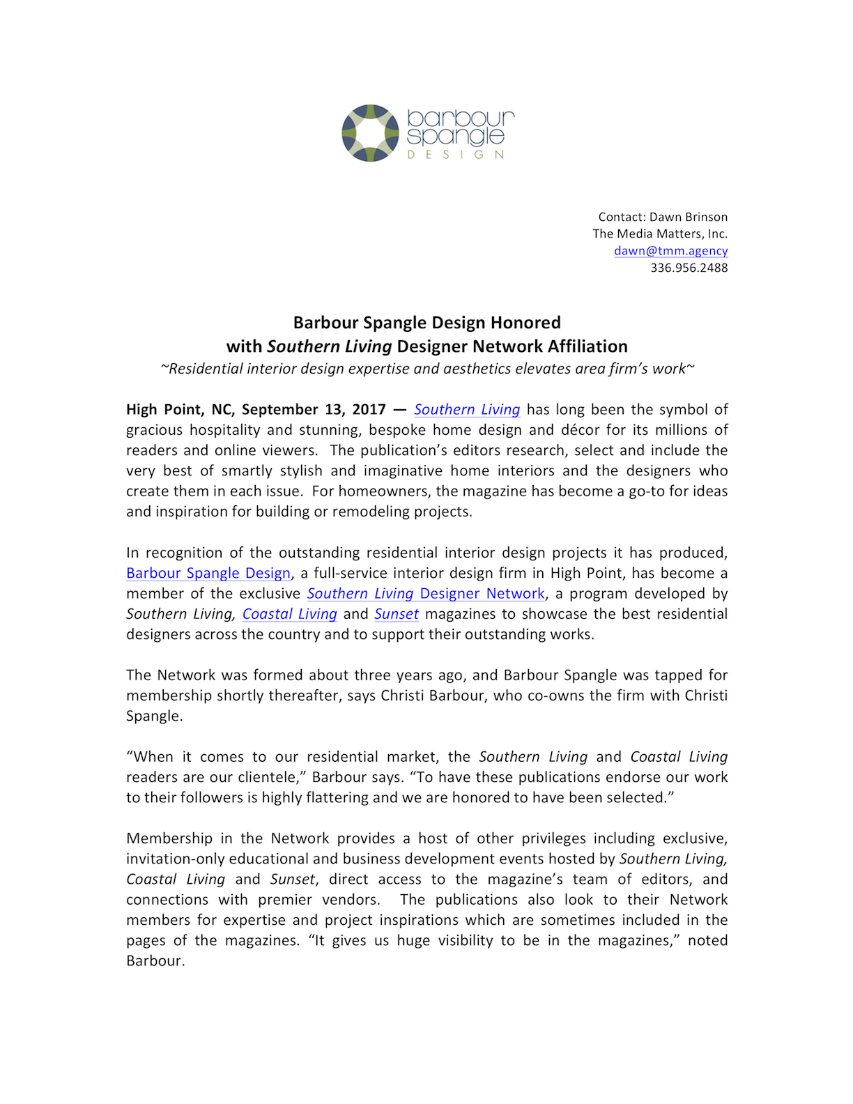 Barbour Spangle Design Honored with Southern Living Designer Network Affiliation