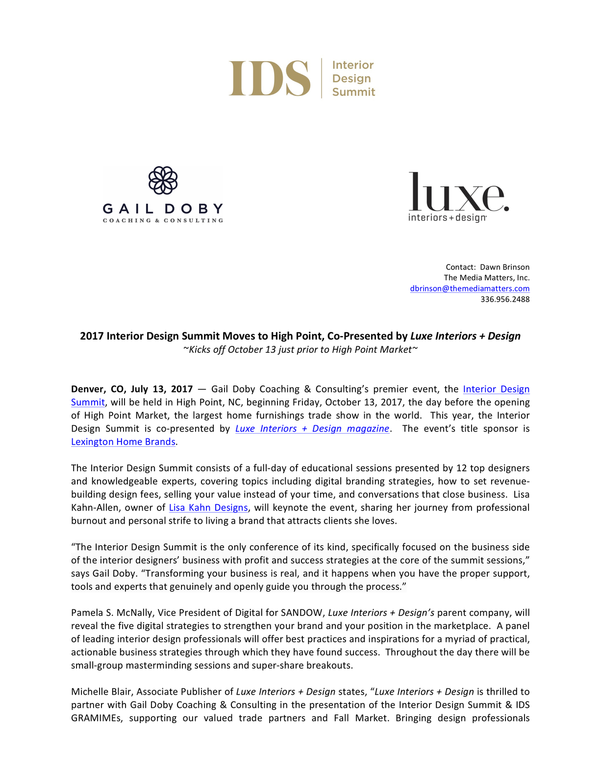 2017 Interior Design Summit Moves to High Point, Co-Presented by Luxe Interiors + Design, July 2017