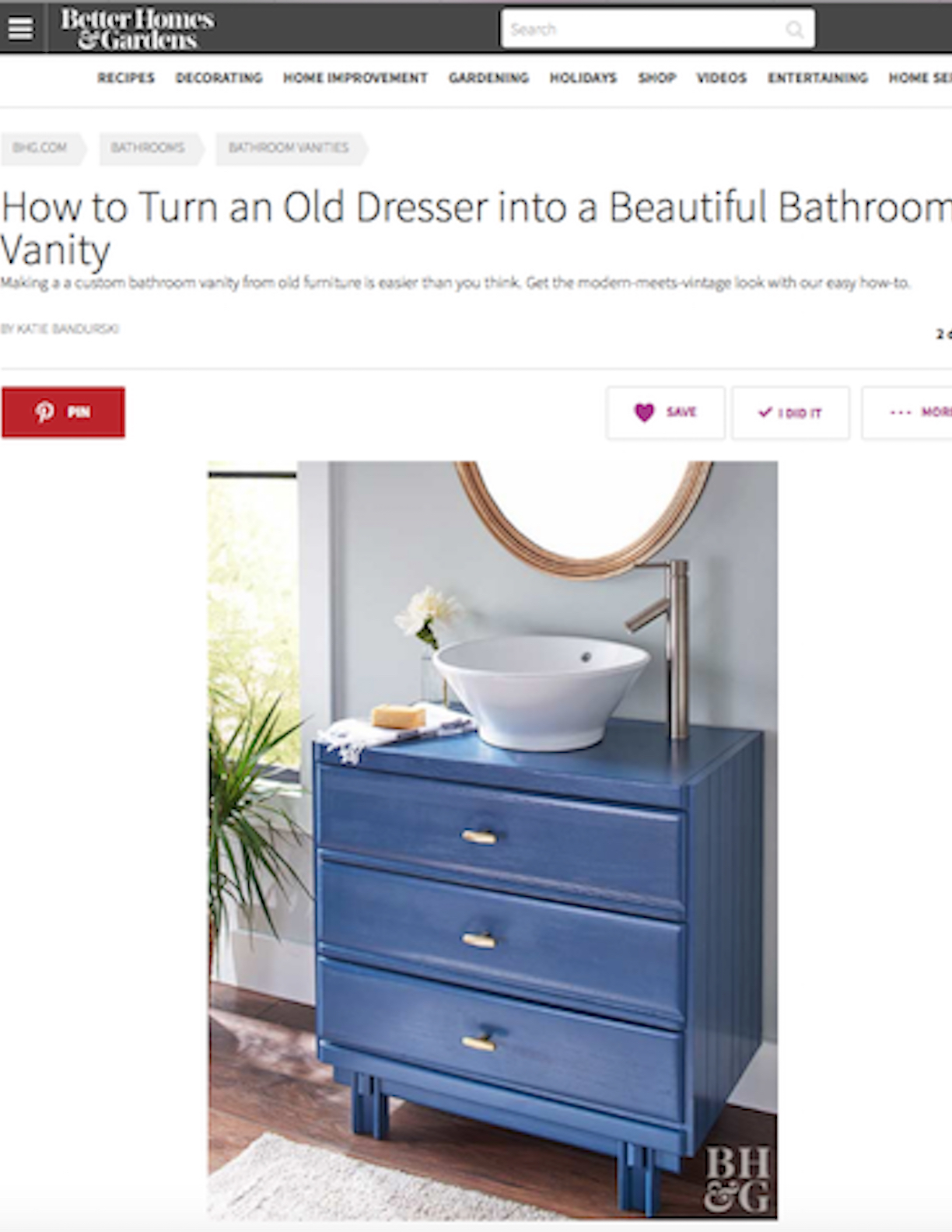 How to Turn an Old Dresser into a Beautiful Bathroom Vanity, BHG.com, June 2017