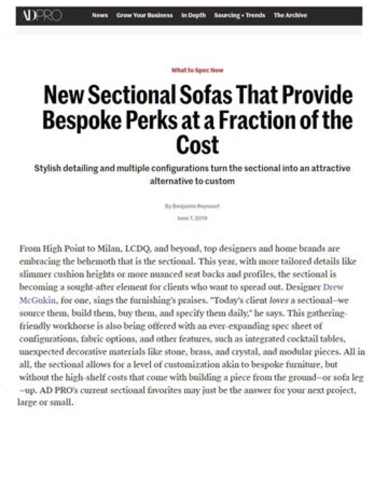 New Sectional Sofas That Provide Bespoke Perks at a Fraction of the Cost, AD PRO, June 2019