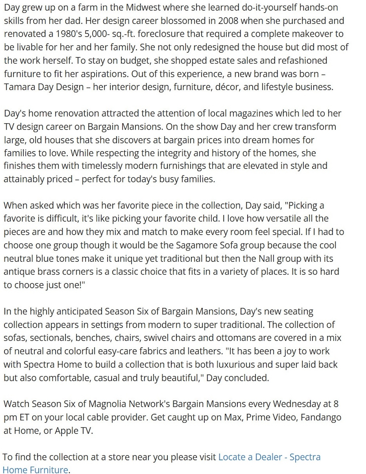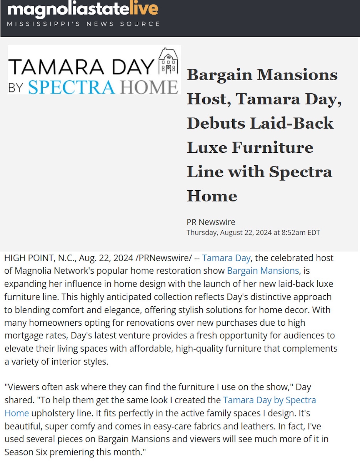 Bargain Mansions Host, Tamara Day, Debuts Laid-Back Luxe Furniture Line with Spectra Home, Magnolia State, August 22, 2024